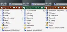 Pre-release builds of Windows Vista offered significantly different metadata and namespace functionality in contrast to the functionality of the build of Windows Vista released to manufacturing. Microsoft constructed several Saved Searches as part of its goals for a new user profile namespace, which replaced traditional user profile folders. Documents, My Music, and My Pictures on the Start menu were replaced by Saved Searches — All Documents, All Music, and All Pictures and Videos — that searched for documents, music, and photos and videos, respectively, with several other Saved Searches for specific content (e.g., authors for documents) also displayed in the navigation pane of Windows Explorer. When viewing All Music or traditional folders with music, for example, the navigation pane would include Saved Searches for all music, albums, artists, genres, favorite music, and ratings.[12][18][19] Stacks in Saved Searches in pre-release builds of Windows Vista could also be created by users, or write properties to data by drag-and-drop — in a feature known as metadata painting, dragging a document onto an author stack, for example, would assign that author to the document.[20] In later builds, Microsoft replaced these Saved Searches with a single Library Saved Search that aggregated content from all locations with subqueries for individual types (e.g., the Music Library searched Library for all music).[12] Microsoft had sought to include metadata painting and user profile namespace virtual folders since the development of WinFS;[21] the objective was for Saved Searches to become the primary way users interact with data.[17][21] Microsoft reportedly received extensive feedback that these changes were confusing — having Saved Searches in the new user profile namespace caused users to believe there were several folders with similar names.[17]