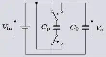 Conceptually, perhaps the simplest switched capacitor configuration is that shown schematically in figure 5. Here two capacitors are simultaneously charged to the same voltage in parallel. The supply is then switched off and the capacitors are switched into series. The output is taken from across the two capacitors in series resulting in an output double the supply voltage. There are many different switching devices that could be used in such a circuit, but in integrated circuits MOSFET devices are frequently employed.[10]