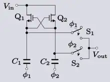 When clock is low transistor Q2 is turned off. At the same time clock is high turning on transistor Q1 resulting in capacitor C1 being charged to Vin. When goes high the top plate of C1 is pushed up to twice Vin. At the same time switch S1 closes so this voltage appears at the output. At the same time Q2 is turned on allowing C2 to charge. On the next half cycle the roles will be reversed: will be low, will be high, S1 will open and S2 will close. Thus, the output is supplied with 2Vin alternately from each side of the circuit.[19]