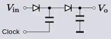 The Dickson charge pump, or Dickson multiplier, consists of a cascade of diode/capacitor cells with the bottom plate of each capacitor driven by a clock pulse train.[p 7] The circuit is a modification of the Cockcroft-Walton multiplier but takes a DC input with the clock trains providing the switching signal instead of the AC input. The Dickson multiplier normally requires that alternate cells are driven from clock pulses of opposite phase. However, since a voltage doubler, shown in figure 7, requires only one stage of multiplication only one clock signal is required.[12]