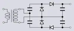 This circuit was first invented by Heinrich Greinacher in 1913 (published 1914[p 2]) to provide the 200–300 V he needed for his newly invented ionometer, the 110 V AC supplied by the Zürich power stations of the time being insufficient.[3] He later extended this idea into a cascade of multipliers in 1920.[p 3][4][p 4] This cascade of Greinacher cells is often inaccurately referred to as a Villard cascade. It is also called a Cockcroft–Walton multiplier after the particle accelerator machine built by John Cockcroft and Ernest Walton, who independently discovered the circuit in 1932.[p 5][5] The concept in this topology can be extended to a voltage quadrupler circuit by using two Greinacher cells of opposite polarities driven from the same AC source. The output is taken across the two individual outputs. As with a bridge circuit, it is impossible to simultaneously ground the input and output of this circuit.[6]
