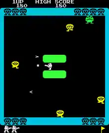 Berobero appear at the corners of the screen and begin to move around randomly, changing color and increasing in value as they approach the center. In Space World, the player can shoot and destroy them by pressing the button, while avoiding the bullets that the Berobero fire back. Destroying three consecutive Berobero of the same color causes a bonus alien to appear, which can be shot for extra points. In Maze World, the player must press the button to set time-delay bombs and catch the Berobero in their explosions; the length of the delay is set by holding the button down. The Berobero do not fire at the player on this screen, and no bonus aliens will appear; however, the player can score extra points by destroying multiple Berobero with one bomb.