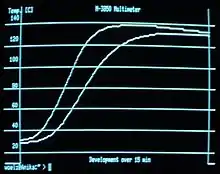 Another major addition was the concept of strip graphs, a mode that emulated paper pen plotters that moved up and down while the paper was wound under them. These were commonly used for recording scientific data, but are perhaps best known on older lie detectors. As new data points were added to one of the graphs, previous data was shifted to the left. Thus, sending a series of Y values using B or J would first cause the line to be drawn from the left to right like the VT55, but additional data points would push the previous data to the left.[26] If markers or vertical axis lines were set, they too were pushed over, following the data.[27] In dual strip mode, adding data to graph 1 caused both graphs to move over at the same time.[26]