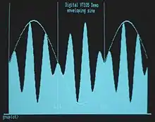 Another change was to re-use the @ command, formerly the noop, to allow a new Y position to be sent in as the shade line. This worked in conjunction with the histogram to allow the direction of the filling to be changed. On the VT55 the filling always drew down from the graph to the base of the display, on the VT105 with the shade line set, this could be set to draw up to the top of the screen, or more commonly, towards a center-point in the data. For instance, with the shade line set to the middle of the screen, if a sine wave was plotted the areas above the center would be shaded downwards and the sections below center upwards, producing a filled-in waveform. Enabling a horizontal line at the same point adds a visual baseline.[24] There were two shade lines in memory, one for each graph, but only one @ command. A bit in register 1 controlled which of the two buffers the @ data was loaded into.[25]
