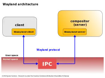 - A low-level layer or wire protocol that handles the inter-process communication between the two involved processes—client and compositor—and the marshalling of the data that they interchange. This layer is message-based and usually implemented using the kernel IPC services, specifically Unix domain sockets in the case of Linux and Unix-like operating systems.[23]: 9