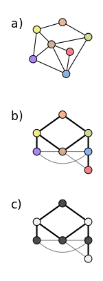 Every graph has a weak 2-coloring. The figure on the right illustrates a simple algorithm for constructing a weak 2-coloring in an arbitrary graph. Part (a) shows the original graph. Part (b) shows a breadth-first search tree of the same graph. Part (c) shows how to color the tree: starting from the root, the layers of the tree are colored alternatingly with colors 1 (dark) and 2 (light).