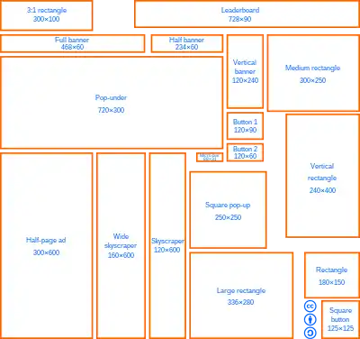 Ad sizes have been standardized to some extent by the IAB. Prior to the IAB standardization, banner ads appeared in over 250 different sizes.[16] However, some websites and advertising networks (outside the Eurosphere or North America) may not use any or all of the IAB base ad sizes. The IAB ad sizes as of 2007 are :[17]