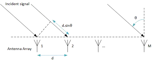 Typical computation of the AoA is done with the MUSIC algorithm. Assuming an antenna array of antennas equally spaced by a distance of and a signal arriving at the antenna array through propagation paths, an additional distance of is traveled by the signal to reach the second antenna of the array.[14]