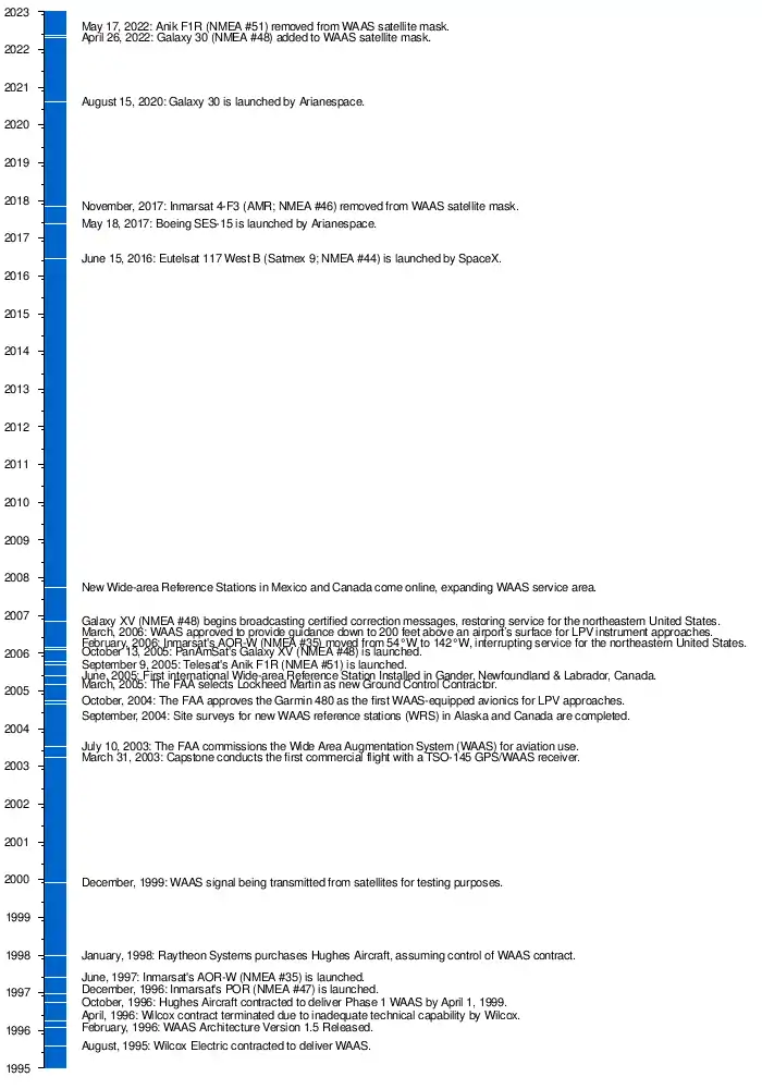 A third satellite was later added to the system. From March to November 2010, the FAA broadcast a WAAS test signal on a leased transponder on the Inmarsat-4 F3 satellite.[14] The test signal was not usable for navigation, but could be received and was reported with the identification numbers PRN 133 (NMEA #46). In November 2010, the signal was certified as operational and made available for navigation.[15] Following in orbit testing, Eutelsat 117 West B, broadcasting signal on PRN 131 (NMEA #44), was certified as operational and made available for navigation on March 27, 2018. The SES 15 satellite was launched on May 18, 2017, and following an in-orbit test of several months, was set operational on July 15, 2019. In 2018, a contract was awarded to place a WAAS L-band payload on the Galaxy 30 satellite. The satellite was successfully launched on August 15, 2020, and the WAAS transmissions were set operational on April 26, 2022, re-using PRN 135 (NMEA #48).[16][17] After approximately three weeks with four active WAAS satellites, operational WAAS transmissions on Anik F1-R were ended on May 17, 2022.[17]