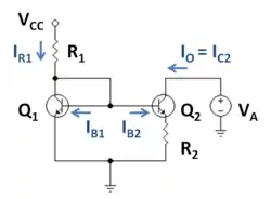 where β2 is the beta-value of the output transistor, which is not the same as that of the input transistor, in part because the currents in the two transistors are very different.[8] The variable IB2 is the base current of the output transistor, VBE refers to base-emitter voltage. This equation implies (using the Shockley diode equation):