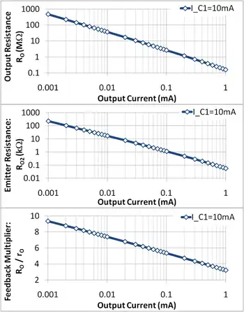 The center panel in Figure 3 shows the design trade-off between emitter leg resistance and the output current: a lower output current requires a larger leg resistor, and hence a larger area for the design. An upper bound on area therefore sets a lower bound on the output current and an upper bound on the circuit output resistance.