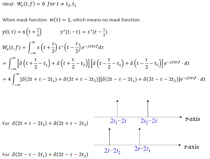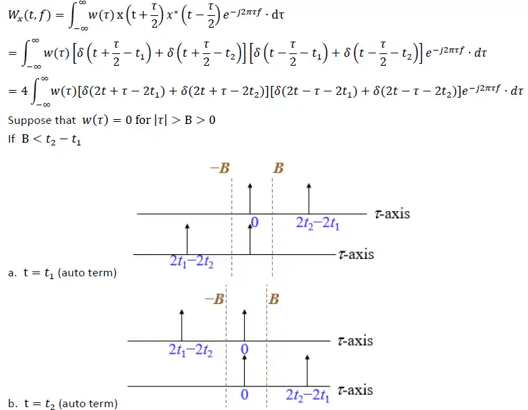 - We can see that have value only between –B to B, thus conducting with can remove cross term of the function. But if x(t) is not a Delta function nor a narrow frequency function, instead, it is a function with wide frequency or ripple. The edge of the signal may still exist between –B and B, which still cause the cross term problem.