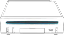 The Wii reads games from an optical media drive located in the front of the device. The drive is capable of reading Nintendo's proprietary discs, the 12 cm Wii discs and 8 cm GameCube discs, but cannot read other common optical media—namely, DVD-Video, DVD-Audio or compact discs. Although Nintendo had planned on incorporating this feature into later revisions of the Wii, the demand for the console meant a delay in their schedule, until the feature lost interest.[81][82][83] The slot of the optical drive is backed by LED lights which show the system's status. For example, it will pulse blue when the system is communicating with the WiiConnect24 service or when reading a disc after being inserted.[84][85]