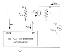 In Fig. 3, transistors Q1 and Q2 are shown as forming a standard two-transistor current mirror. It is sufficient for calculating the output impedance[1][3] to assume that the output current of this current mirror subcircuit, , is equal to the input current, , or . Transistor Q3 is represented by its low-frequency hybrid-pi model with a current controlled dependent current source for the collector current.
