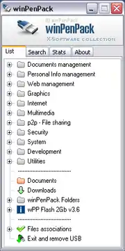 winPenPack (often shortened to wPP) is an open-source software application suite for Windows. It is a collection of open source applications that have been modified to be executed directly from a USB flash drive (or any other removable storage device) without prior installation. WinPenPack programs are distributed as free software, and can be downloaded individually or grouped into suites.