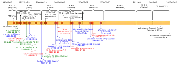Windows Embedded Compact 2013 is the final version of Windows CE. It had mainstream support until October 9, 2018, and extended support ended on October 10, 2023; however, license sales for OEMs will continue until 2028.[15][4][16][17]