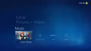 Each button in the main menu, which contains sections such as "Music", "Videos", and "TV", gets encased in a box when selected, and for each selection, a submenu comes up, extending horizontally. When any of the options is selected, the entries for each are presented in a grid-like structure, with each item being identified by album art, if it is an audio file, or a thumbnail image if it is a picture, a video or a TV recording, and other related options, such as different views for the music collection if "Music" is selected, extend horizontally along the top of the grid. Similarly, other items are identified by suggestive artwork. The grid displaying the items is also extended horizontally, and the selected item is enlarged compared to the rest. Other features of the WMC include: