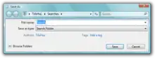 It is also possible to save a search query as a Virtual Folder, called a Saved Search or Search Folder which, when accessed, runs the search with the saved query and returns the results as a folder listing. Physically, a search folder is just an XML file (with a .search-ms extension) which stores the search query (in either AQS or NQS), including the search operators as well. Windows Vista also supports query composition, where a saved search (called a scope) can be nested within the query string of another search.[46][47] Search Folders are also distributable via RSS. By default, Windows references the profile of the user who originally created a Search Folder as part of the query's scope.[48] This design choice does not prevent saved searches from being shared with other users, but it prevents them from operating on different user profiles. While users can manually modify the contents of a saved search so that the scope references the %USERPROFILE% environment variable, which will enable it to operate on other machines or profiles regardless of the original author, Microsoft has released a SearchMelt Creator utility that automates this process for the user.[48]