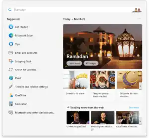 ![]() The search pane in Windows 11 showing suggested/recent files on the left and Bing search on the right. | |