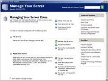 ![]() Screenshot of Windows Server 2003, showing the Server Manager application which is automatically opened when an administrator logs on | |