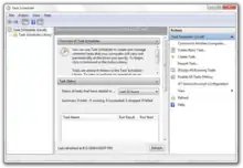 Task Scheduler 2.0 was introduced with Windows Vista[18] and included in Windows Server 2008 as well.[19][9] The redesigned Task Scheduler user interface is now based on Management Console. In addition to running tasks on scheduled times or specified intervals, Task Scheduler 2.0 also supports calendar and event-based triggers, such as starting a task when a particular event is logged to the event log, or when a combination of events has occurred. Also, several tasks that are triggered by the same event can be configured to run either simultaneously or in a pre-determined chained sequence of a series of actions, instead of having to create multiple scheduled tasks. Tasks can also be configured to run based on system status such as being idle for a pre-configured amount of time, on startup,[20] logoff, or only during or for a specified time. XPath expressions can be used to filter events from the Windows Event Log. Tasks can also be delayed for a specified time after the triggering event has occurred, or repeat until some other event occurs. Actions that need to be done if a task fails can also be configured. The actions that can be taken in response to triggers, both event-based as well as time-based, not only include launching applications but also take a number of custom actions. Task Scheduler includes a number of actions built-in, spanning a number of applications; including send an e-mail, show a message box, or fire a COM handler when it is triggered. Custom actions can also be specified using the Task Scheduler API. Task Scheduler keeps a history log of all execution details of all the tasks.[21] Windows Vista uses Task Scheduler 2.0 to run various system-level tasks;[22] consequently, the Task Scheduler service can no longer be disabled (except with a simple registry tweak).