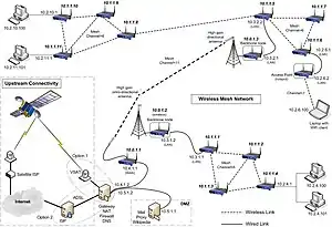 A wireless mesh network (WMN) is a communications network made up of radio nodes organized in a mesh topology. It can also be a form of wireless ad hoc network.[1]
