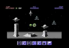 Wizball is a scrolling shooter inspired by Gradius[5] with an additional collection dynamic. It is a horizontally scrolling game taking place over eight levels, which involves navigating around a landscape and shooting at sprites. However, the aim of the game is to collect droplets of coloured paint to colour the level. Each level starts off as monochromatic, drawn in three shades of grey, and needs three colours (red, blue, and green) to be collected to complete it.[6] The player, a wizard who has taken the form of a green ball, can navigate between the levels through portals. At first the wizard only has access to the first three levels, but completing levels gains access to further levels.[7] Each level has bouncing spheres of a different colours, and shooting them releases droplets, which may be collected. Each level needs a different colour to be added, which can be composed by collecting sufficient quantities of the correct colours. On later levels, the spheres of paint start shooting bullets, further adding to the challenge.