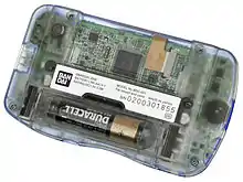 The main CPU of the WonderSwan is a 16-bit NEC V30 MZ, a variant of the Intel 8086.[16][17] The original model's screen is capable of displaying up to eight shades of gray, in contrast to the four displayed by the WonderSwan's main competitor, the Game Boy. Similar to the Atari Lynx, the handheld has an extra set of buttons allowing the console to be played at different angles; for the WonderSwan, these buttons were used to allow gamers to play games in both the portrait and landscape orientations. The WonderSwan series are all powered by a single AA battery, with the original monochrome version having a battery life of 40 hours.[7] It also allows players to record their personal information, such as their name, birth date, and blood type, which then can be accessed and used by the game.[18] Its LCD screen is 2.49 inches (6.3 cm) and displays at a resolution of 224 × 144.[6] Its sound capabilities consist of four PCM channels, each of which can play 32-sample, 4-bit sounds at selectable volume and pitch levels.[19]