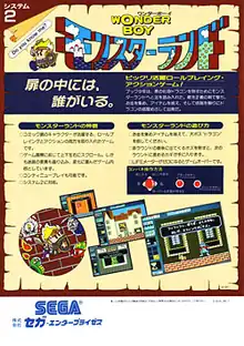Wonder Boy in Monster Land, known by its original arcade release as Wonder Boy: Monster Land,[lower-alpha 1] is a platform video game developed by Westone Bit Entertainment and released by Sega in Japanese arcades in 1987 and for the Master System in 1988, with a number of other home computer and console ports following. The game is the sequel to the 1986 game Wonder Boy and takes place eleven years after the events in the previous game. After enjoying over a decade of peace on Wonder Land following the defeat of the evil King by Tom-Tom, later bestowed the title "Wonder Boy", a fire-breathing dragon called the MEKA dragon appeared; he and his minions conquered Wonder Land, turning it into "Monster Land". The people, helpless due to their lack of fighting skill, call for Wonder Boy, now a teenager, to destroy the monsters and defeat the MEKA dragon. Players control Wonder Boy through twelve linear levels as he makes his way through Monster Land to find and defeat the MEKA dragon. Players earn gold by defeating enemies and buy weapons, armor, footwear, magic, and other items to help along the way.