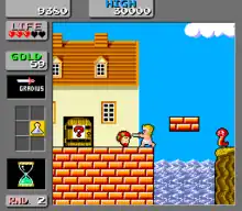 Wonder Boy has a life meter which consists of a series of red hearts; he starts the game with five red hearts. Whenever he sustains damage those hearts turn black. When all the hearts turn black, Wonder Boy dies, and the game ends. Players score points whenever Wonder Boy defeats enemies and collects certain treasures, and at certain point intervals Wonder Boy receives an additional life heart.[10] Players earn gold throughout the game in order to purchase weapons, magic weapons, and other items in shops and rooms. Gold is obtained from enemies, while some are hidden in odd places such as trees and clouds.[11] The game has an "Hourglass Timer" on the top of the screen; whenever the Hourglass Timer runs out, Wonder Boy loses some life. The Hourglass Timer can be refilled by collecting hourglasses or by visiting hospitals or taverns.[12][13] In the ZX Spectrum version of the game, a candle represents the timer.[7]