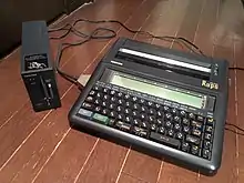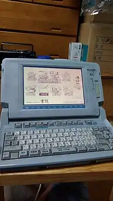 The Japanese writing system uses a large number of kanji (logographic Chinese characters) which require 2 bytes to store, so having one key per each symbol is infeasible. Japanese word processing became possible with the development of the Japanese input method (a sequence of keypresses, with visual feedback, which selects a character) -- now widely used in personal computers. Oki launched OKI WORD EDITOR-200 in March 1979 with this kana-based keyboard input system. In 1980 several electronics and office equipment brands including entered this rapidly growing market with more compact and affordable devices. For instance, NEC introduced the NWP-20, and Fujitsu launched the Fujitsu OASYS. While the average unit price in 1980 was 2,000,000 JPY (US$14,300), it was dropped to 164,000 JPY (US$1,200) in 1985.[20] Even after personal computers became widely available, Japanese word processors remained popular as they tended to be more portable (an "office computer" was initially too large to carry around), and become commonplace for business and academics, even for private individuals in the second half of the 1980s.[21] The phrase "word processor" has been abbreviated as "Wa-pro" or "wapuro" in Japanese.