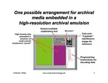 ![]() Example of one possible WORF slide illustrating data, human readable microtext, indexing codes, a full-spectrum color image, and instructions for building a reader and decoding the data. WORF media is agnostic. | |