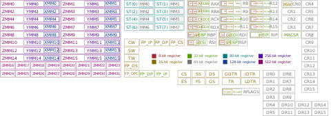 | Extensions | x87, IA-32, x86-64, x86-S, MMX, 3DNow!, SSE, MCA, ACPI, SSE2, NX bit, SMT, SSE3, SSSE3, SSE4, SSE4.2, AES-NI, CLMUL, RDRAND, SHA, MPX, SME, SGX, XOP, F16C, ADX, BMI, FMA, AVX, AVX2, AVX-VNNI, AVX512, AVX10, VT-x, VT-d, AMD-V, AMD-Vi, TSX, ASF, TXT, APX |