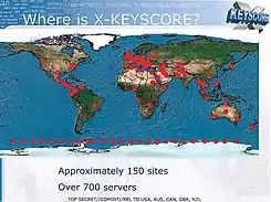 XKeyscore consists of over 700 servers at approximately 150 sites where the NSA collects data, like "US and allied military and other facilities as well as US embassies and consulates" in many countries around the world.[14][15][16] Among the facilities involved in the program are four bases in Australia and one in New Zealand.[15]