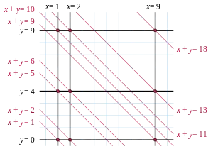 In computer science, sorting is the problem of sorting pairs of numbers by their sums. Applications of the problem include transit fare minimisation, VLSI design, and sparse polynomial multiplication. As with comparison sorting and integer sorting more generally, algorithms for this problem can be based only on comparisons of these sums, or on other operations that work only when the inputs are small integers.
