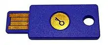 The YubiKey is a hardware authentication device manufactured by Yubico to protect access to computers, networks, and online services that supports one-time passwords (OTP), public-key cryptography, and authentication, and the Universal 2nd Factor (U2F) and FIDO2 protocols[1] developed by the FIDO Alliance. It allows users to securely log into their accounts by emitting one-time passwords or using a FIDO-based public/private key pair generated by the device. YubiKey also allows storing static passwords for use at sites that do not support one-time passwords.[2] Google, Amazon, Microsoft, Twitter, and Facebook use YubiKey devices to secure employee accounts as well as end-user accounts.[3][4][5] Some password managers support YubiKey.[6][7] Yubico also manufactures the Security Key, a similar lower-cost device with only FIDO2/WebAuthn and FIDO/U2F support.[8][9]