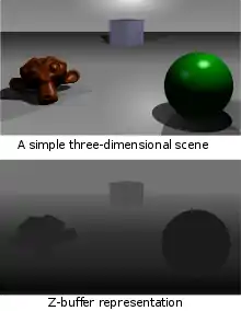 A depth buffer, also known as a z-buffer, is a type of data buffer used in computer graphics to represent depth information of objects in 3D space from a particular perspective. The depth is stored as a height map of the scene, the values representing a distance to camera, with 0 being the closest. The encoding scheme may be flipped with the highest number being the value closest to camera. Depth buffers are an aid to rendering a scene to ensure that the correct polygons properly occlude other polygons. Z-buffering was first described in 1974 by Wolfgang Straßer in his PhD thesis on fast algorithms for rendering occluded objects.[1] A similar solution to determining overlapping polygons is the painter's algorithm, which is capable of handling non-opaque scene elements, though at the cost of efficiency and incorrect results.