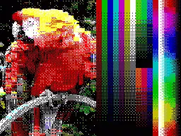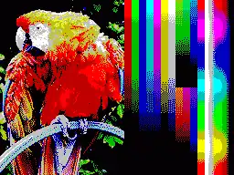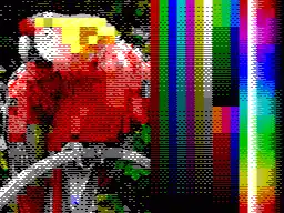 The image size of the framebuffer is 256x192 pixels, with a palette of 15 non-modifiable colours, where the entire colour palette is extremely saturated. The resolution of the colour output is 64 times lower than the resolution of the pixel bitmap.[1][2] The extremely low colour resolution was used to conserve memory, totaling just 768 bytes for colour attributes. Colour is stored separate from the pixel bitmap, as a 32x24 cell grid, using one byte per each of the character cells. One character cell is composed of 8x8 pixels. In practice, this means any character cell can only use two selected colours for colouring the contained 64 pixels.[3]