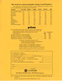 As a joke, Wozniak decided to print a "20,000 brochures" (according to YouTube video "Rare video of Steve Wozniak from 1984 talking about computing, joining Apple and the Mac" filmed at a Cleveland computer club meeting) of a fake product called the 'Zaltair' with a lot of "superlative descriptions of a computer that solved every problem in the world".[1] It advertised, among other things, a new version of the BASIC programming language called "BAZIC", with the ability to "define your own language... a feature we call perZonality".[2]