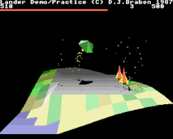 The player flies the lander over an undulating landscape of square tiles. The landscape routine uses fixed tile sizes, meaning that the depth of view (amount of terrain being rendered) directly influences the frame rate. In development, a greater depth of view reduced the frame rate to only one or two per second. Bank switching is used, with the display being in 256-color Mode 13. The higher resolution Mode 15 was not used because that leaves less available memory and the required VIDC bandwidth also slows down the processor.[3]
