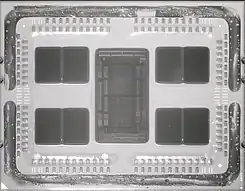 A delidded AMD 7702 featuring 8 CCDs and 1 I/O die, with remains of the solder thermal interface material (TIM) on the chiplets.