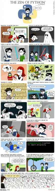 The Zen of Python is a collection of 19 "guiding principles" for writing computer programs that influence the design of the Python programming language.[1] Python code that aligns with these principles is often referred to as "Pythonic".[2]