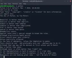 Peters' Zen of Python was included as entry number 20 in the language's official Python Enhancement Proposals and was released into the public domain.[4] It is also included as an Easter egg in the Python interpreter, where it can be displayed by entering import this.[1][4][lower-alpha 1]