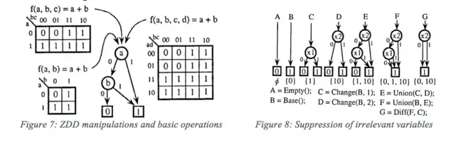 Here we have the basic operations for ZDDs, as they are slightly different from those of the original BDDs. One may refer to Figure 8 for examples generated from the table below.