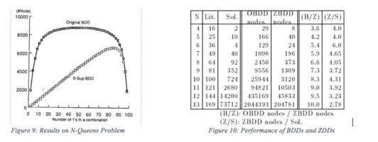 Minato has proved that ZDDs are especially suitable for combinatorial problems, such as the classical problems in two-level logic minimization, knight's tour problem, fault simulation, timing analysis, the N-queens problem, as well as weak division. By using ZDDs, one can reduce the size of the representation of a set of n-bit vectors in OBDDs by at most a factor of n. In practice, the optimization is statistically significant.