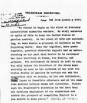 The Zimmermann Telegram (or Zimmermann Note or Zimmermann Cable) was a secret diplomatic communication issued from the German Foreign Office in January 1917 that proposed a military contract between the German Empire and Mexico if the United States entered World War I against Germany. With Germany's aid, Mexico would recover Texas, Arizona, and New Mexico. The telegram was intercepted by British intelligence.