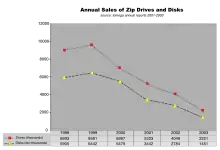 Sales of Zip drives and disks declined steadily from 1999 to 2003.[10] Zip disks had a relatively high cost per megabyte compared to the falling costs of then-new CD-R and CD-RW discs.