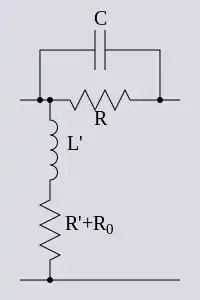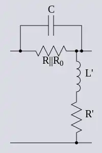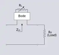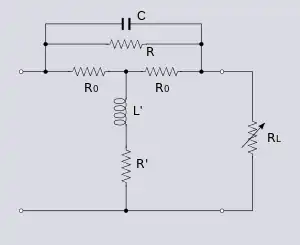 A Bode network, as with a Zobel network, is a symmetrical bridge T network which meets the constant k condition. It does not however meet the constant resistance condition, that is, the bridge is not in balance.[4] Any impedance network, Z, can be used in a Bode network, just as with a Zobel network, but the high pass section shown for correcting high-end frequencies is the most common. A Bode network terminated in a variable resistor can be used to produce a variable impedance at the input terminals of the network. A useful property of this network is that the input impedance can be made to vary from a capacitive impedance through a purely resistive impedance to an inductive impedance all by adjusting the single load potentiometer, RL. The bridging resistor, R0, is chosen to equal the nominal impedance so that in the special case when RL is set to R0 the network behaves as a Zobel network and Zin is also equal to R0.