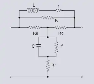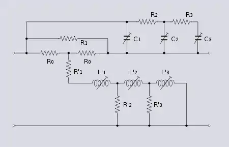 Zobel networks are a type of filter section based on the image-impedance design principle. They are named after Otto Zobel of Bell Labs, who published a much-referenced paper on image filters in 1923.[1] The distinguishing feature of Zobel networks is that the input impedance is fixed in the design independently of the transfer function. This characteristic is achieved at the expense of a much higher component count compared to other types of filter sections. The impedance would normally be specified to be constant and purely resistive. For this reason, Zobel networks are also known as constant resistance networks. However, any impedance achievable with discrete components is possible.