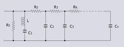 To equalise long video lines, a network with Cauer topology is used as the Z impedance of a Zobel constant resistance network. Just as the input impedance of a Bode network is used as the Z impedance of a Zobel network to form a Zobel Bode equaliser, so the input impedance of a Cauer network is used to make a Zobel Cauer equaliser. The equaliser is required to correct an attenuation increasing with frequency and for this a Cauer ladder network consisting of series resistors and shunt capacitors is required. Optionally, there may be an inductor included in series with the first capacitor which increases the equalisation at the high end due to the steeper slope produced as resonance is approached. This may be required on longer lines. The shunt resistor R1 provides the basic loss of the Zobel network in the usual way.